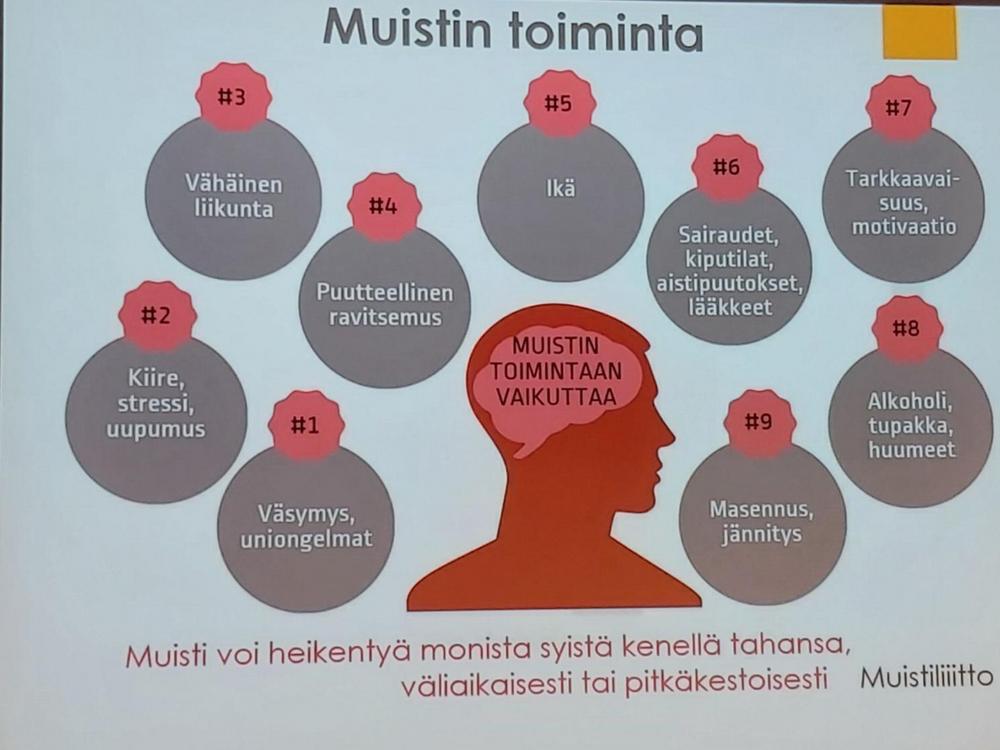 Huhtikuun kuukausitapaamisessa kuulimme muistista ja aivoterveydestä. Salon Muistiyhdistyksen muistiohjaaja Pauliina Römpötti valaisi meitä mm. kaikenlaisen kanssakäymisen, kultturin ja liikunnan tärkeydestä. Mikä sen mukavampaa kuin yhteiset riennot. Omat virikekerhomme vetäjät Anna-Liisa Veslin ja Anja Laakkio kertoivat toiminasta ja aktivoivats aivojamme hauskoilla aivopähkinöillä.