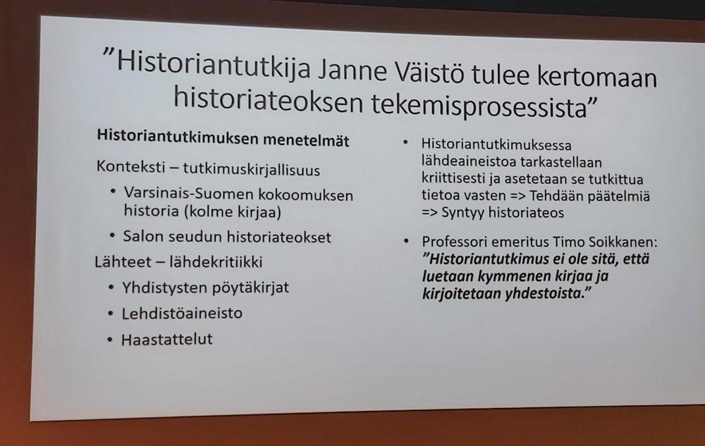 Toukokuun viimeinen kuukausitapaaminen sujui mukavasti hyvän ruuan ja mielenkiintoisen esitelmän parissa. Salolainen historiantutkija Janne Väistö Åbo Akademista kertoi historiateoksen kirjoitusprosessista. Mukavaa kesää kaikille.
