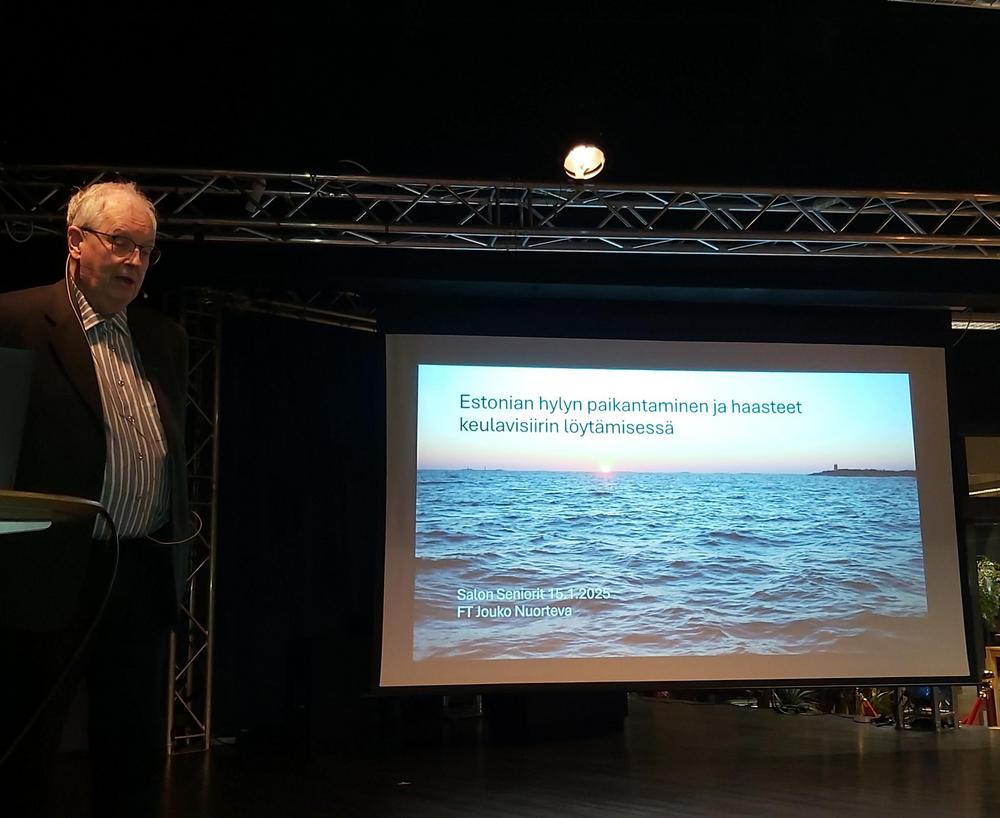 Uusi vuosi ja uudet kujeet! Ke 15.1. kuukausitapaamisessamme merigeologi Jouko Nuorteva kertoi meille Estonian ja sen keulavisiirin löytämisen haasteista. Meitä oli paikalla reilu 140. Kuulimme myös tulevista aktiviteeteista ja matkoista ja tietysti söimme Marjon herkkuja.