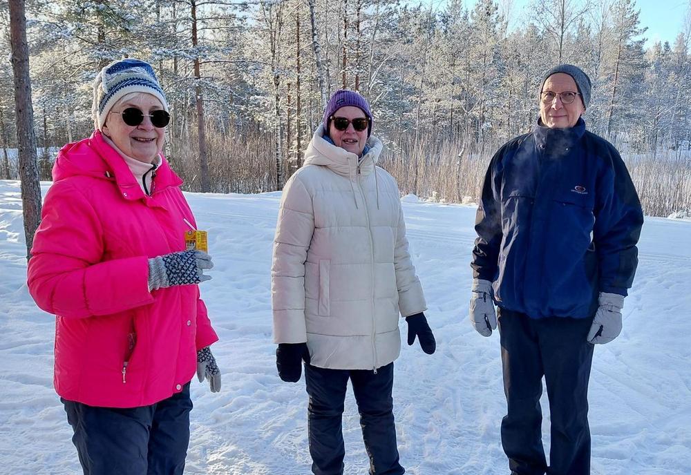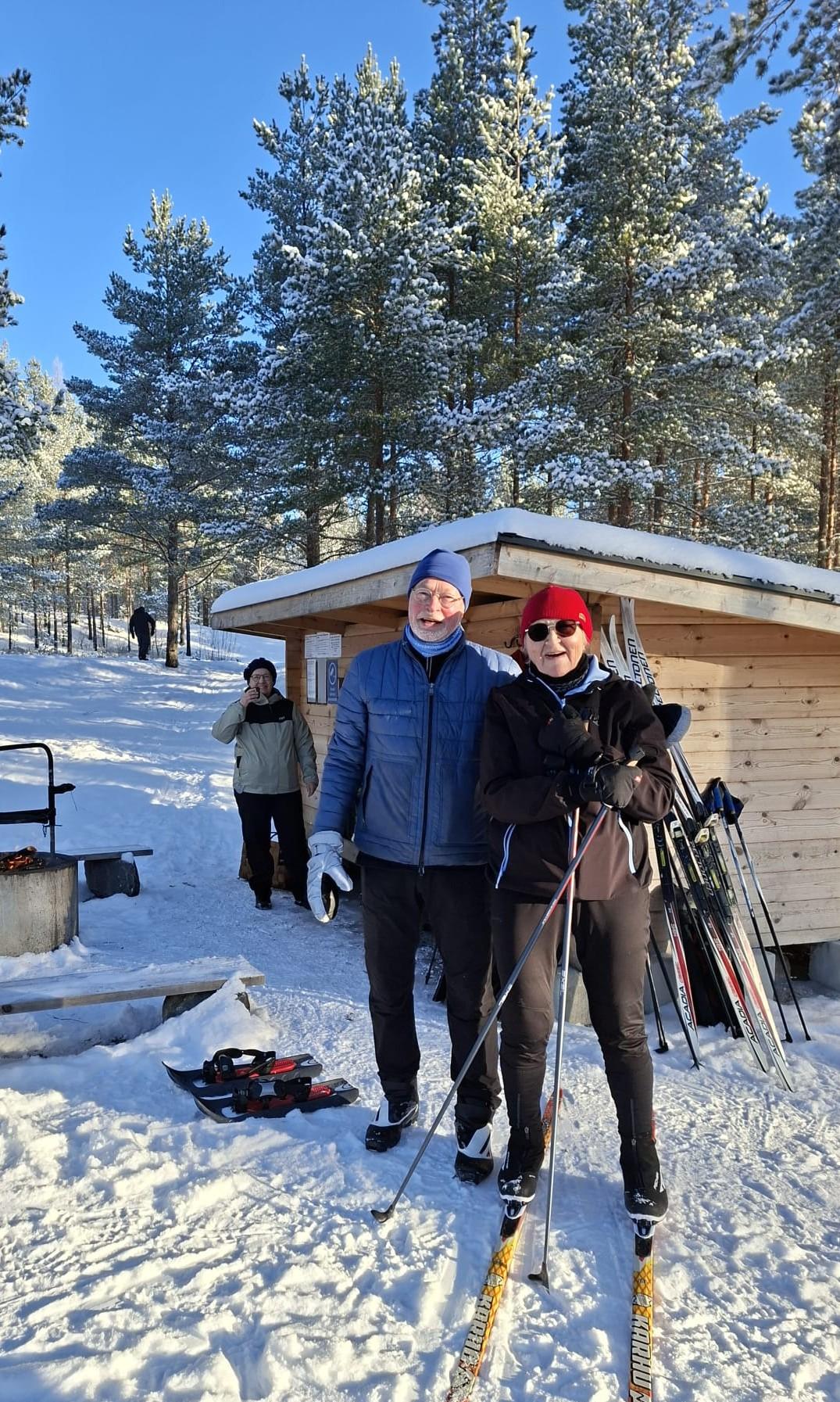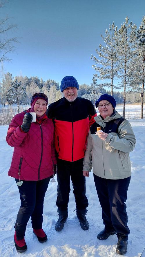 Reippaat pakkasta (-14c) pelkäämättömät seniorit hiihto- ja ulkoiluretkellä Märynummella. Sää oli upea ja ladut justiinsa ajettu. Harvinaista herkkua! Laavulla maistui makkara ja mehu. Pienen pieni päästäinenkin tuli jaolle, taisi jo karata kuvista.