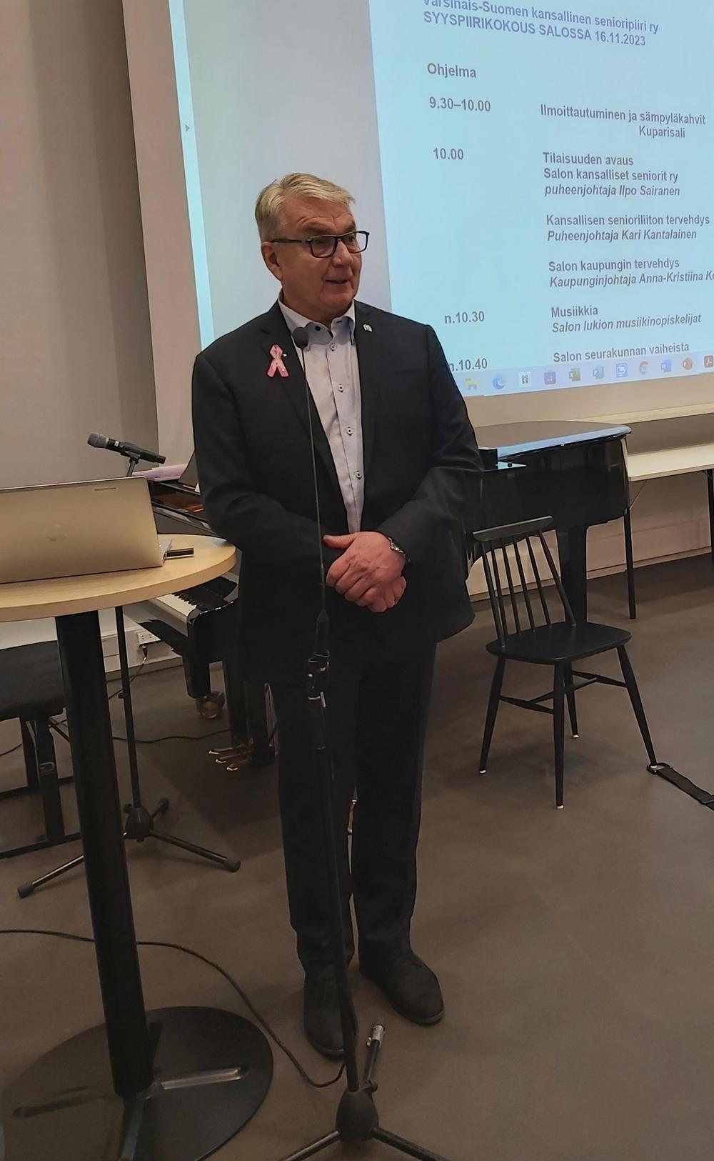Varsinais-Suomen kansallisen Senioripiirin syyskokous pidetiin Salossa torstaina 16.11., Salon uuden seurakuntatalon Kuparisalissa. Yllä kuvia aamupäivän tapahtumista. Tilaisuuden avasi Salon yhdistyksen puheenjohtaja Ilpo Sairanen, liiton tervehdyksen toi puheenjohtaja Kari Kantalainen ja Salon kaupungin tervehdyksen kaupunginjohtaja Anna-Kristiina Korhonen. Lukiolaiset Enni ja Edith musisoivat. Salon seurakunnan vaiheista ja uudesta seurakuntatalosta meille kertoi kirkkoherra Timo Hukka ja lopuksi kuulimme tarinaa linnuista lintuharrastaja Martti Santakarin opastuksella.